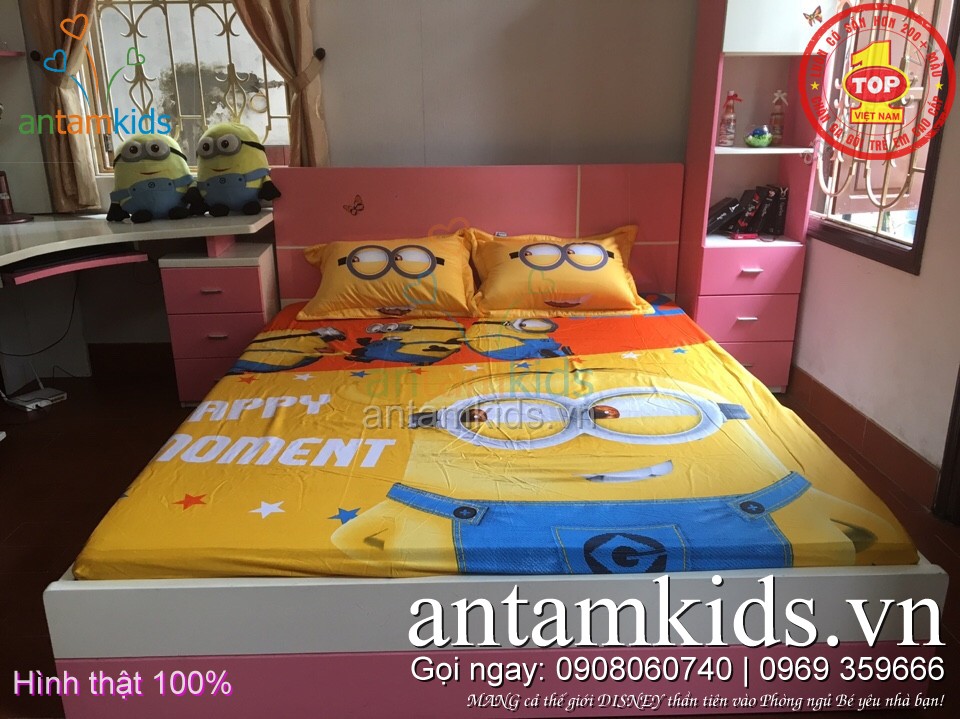 Bộ Drap trải giường hình Minions dành cho bé trai bé gái màu vàng - cam - xanh dương cực dễ thương - Hình thật 100% của AnTamKids.vn