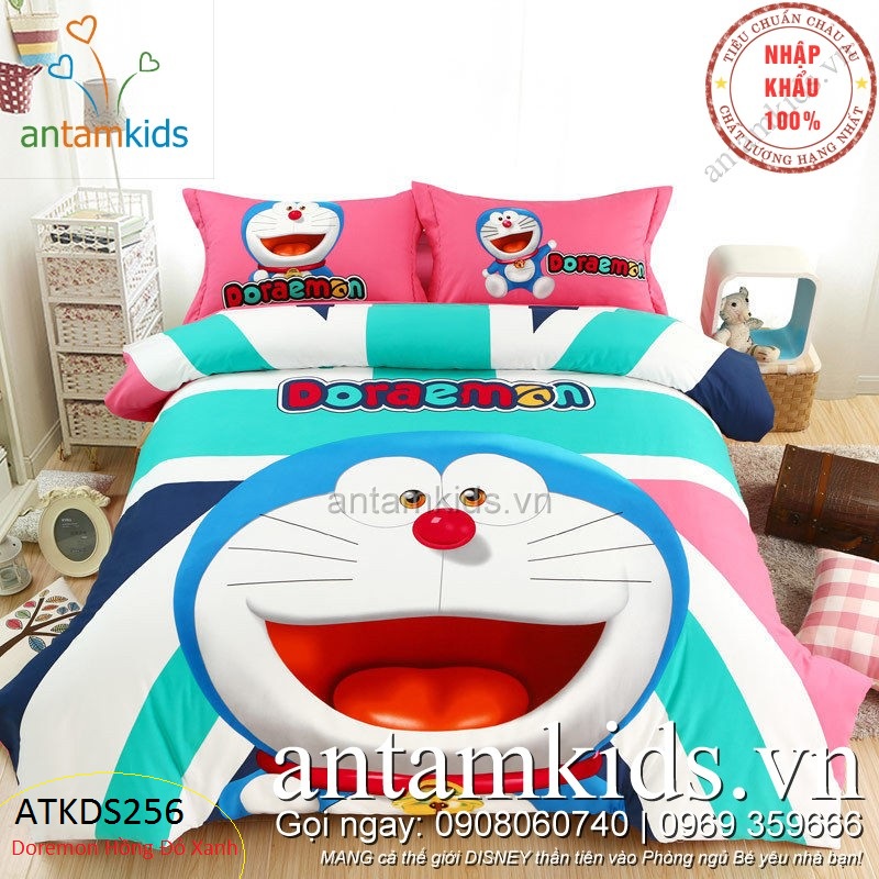 Chăn ga gối Doremon Hồng Đỏ Xanh siêu đáng yêu cho bé gái ATKDS256