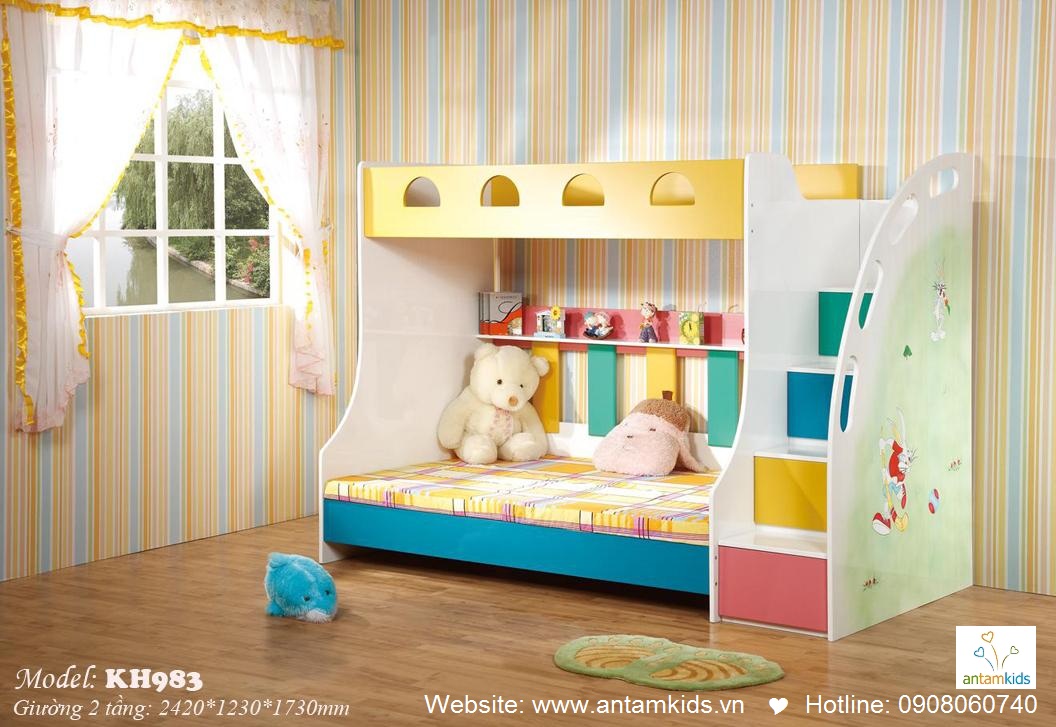Đây là mẫu Giường 2 tầng trẻ em xinh xắn tiết kiệm không gian nhà bạn, rất thích hợp cho gia đình có 2 em bé. Dưới giường tầng có 3 ngăn kéo & bên trên có thêm giá sách để con trẻ có thể trưng bày vài cuốn sách hay những món đồ trang trí đáng yêu giúp căn phòng của bé thêm tinh tế và gọn gàng ngăn nắp .