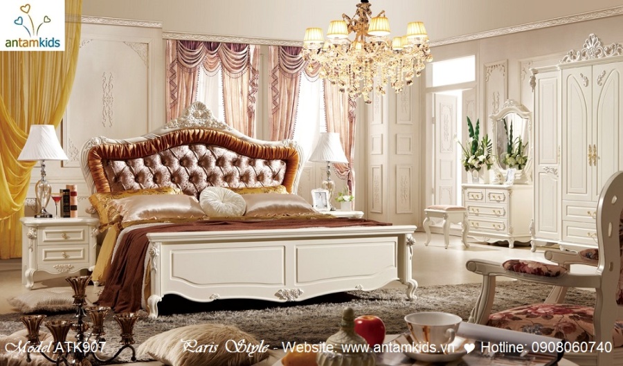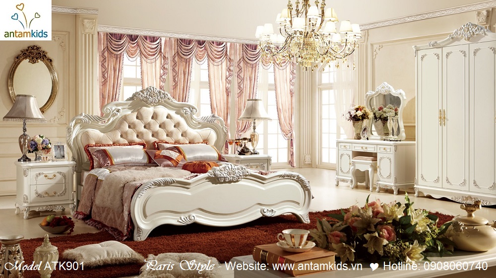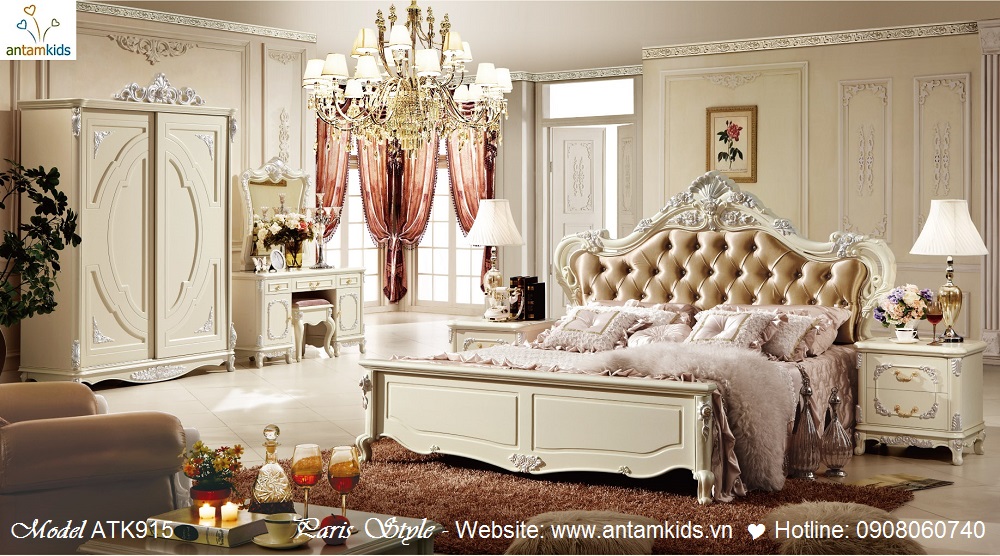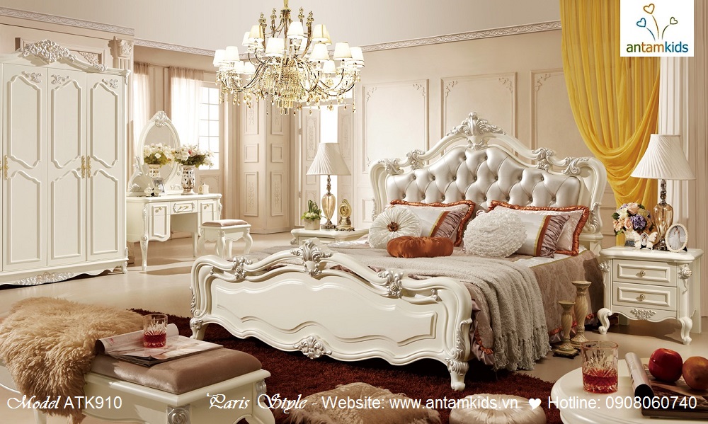 Dòng Nội thất cổ điển phong cách Pháp – Paris Style màu trắng ngà sang trọng, trẻ trung đầy quyến rũ với những đường nét chạm khắc cầu kỳ sắc xảo, những đường cong uốn lượn tinh tế đẹp hoàn hảo đầy lôi cuốn đam mê.