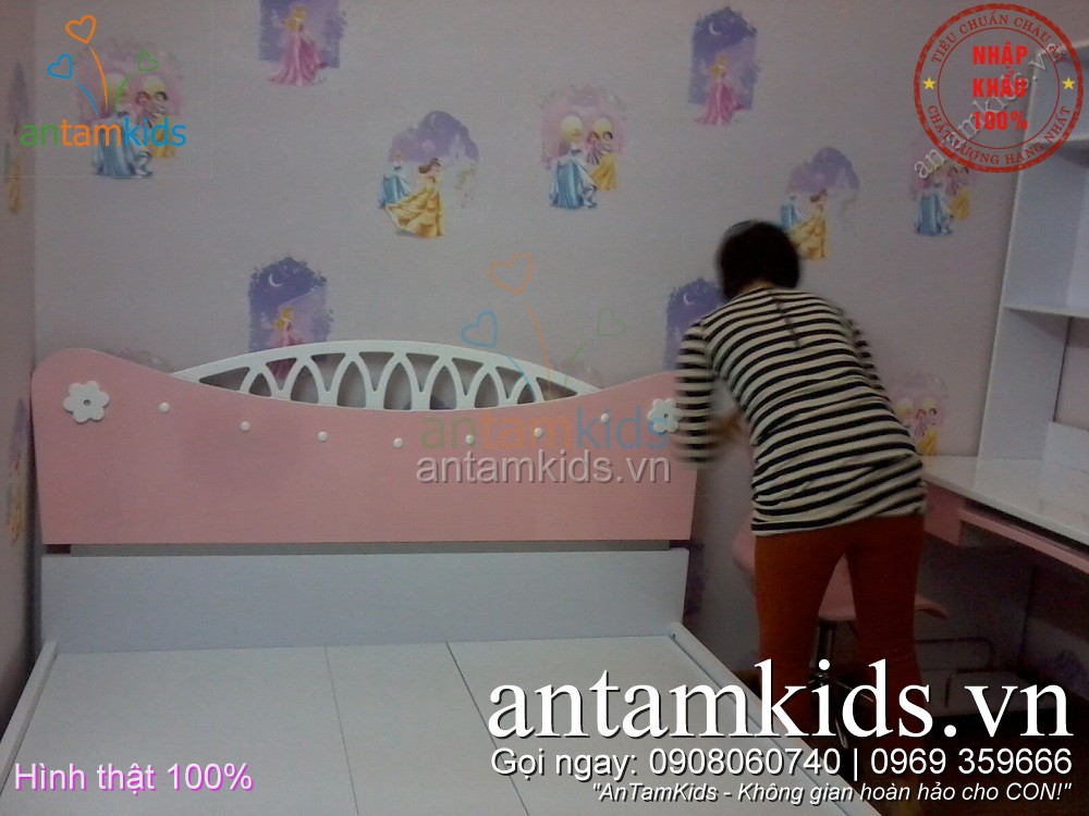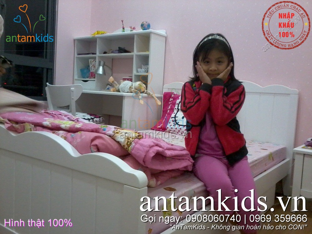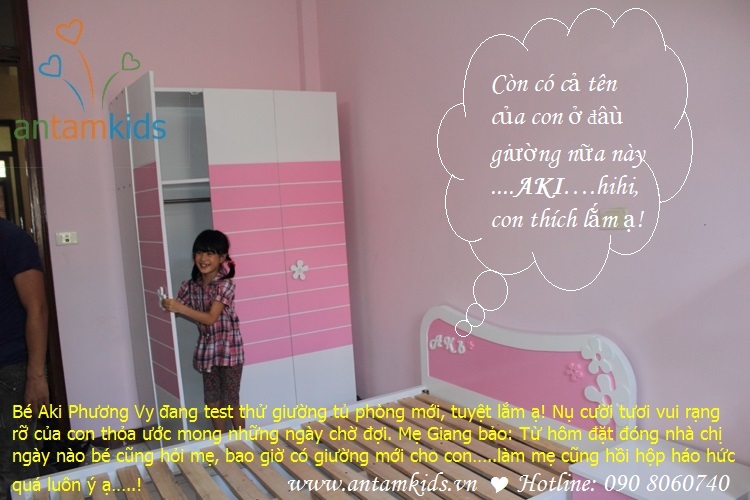 Buổi tối mẹ Giang allo cho AnTamKids: "Hihi, Đẹp chị ạ, nói chung là em hài lòng. Chiều nay đi khoe với ông bà nội, cháu thích & tự hào lắm. Ai xem cũng khen ạ. Em đang giặt ga gối chưa khô chưa trải ra được, mà buổi trưa 2 chị em cháu cứ nằm ngủ ngay vậy đó, ko chịu đi đâu hết!" Hihi, vì mẹ của Aki cũng khéo chọn mẫu phòng xinh hợp ý con đấy mà.
