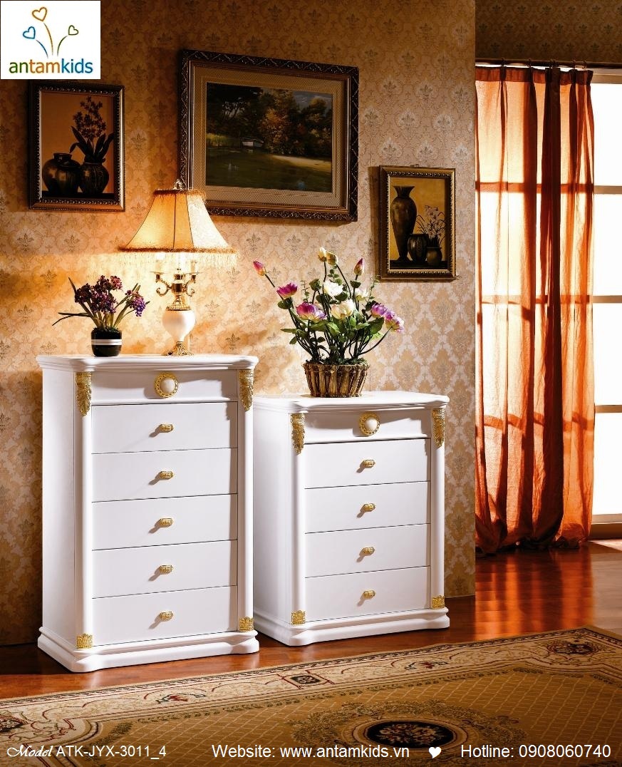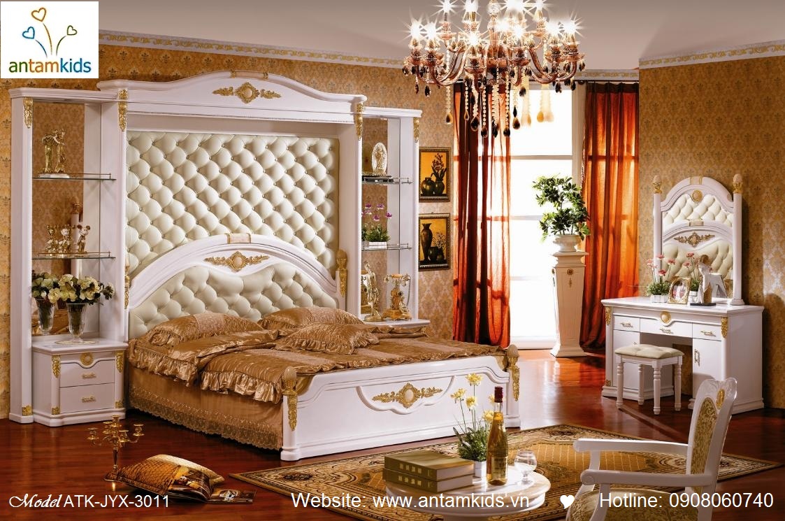 Màu sắc: màu trắng sữa có trang trí mạ vàng 24K, được trang trí trạm khắc rất cầu kỳ tinh tế, là lựa chọn tuyệt vời cho gia đình bạn có được một căn phòng ngủ thật đẹp và sang trọng.