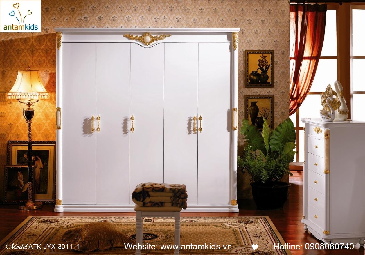 Bộ phòng ngủ cổ điển ATK-JYX-3011 gồm 05 món: 01 Giường đôi 1m8 * 2m trong lòng + 01 Tủ áo 5 cánh + 01 Bàn trang điểm + 01 Ghế trang điểm + 01 táp đầu giường.